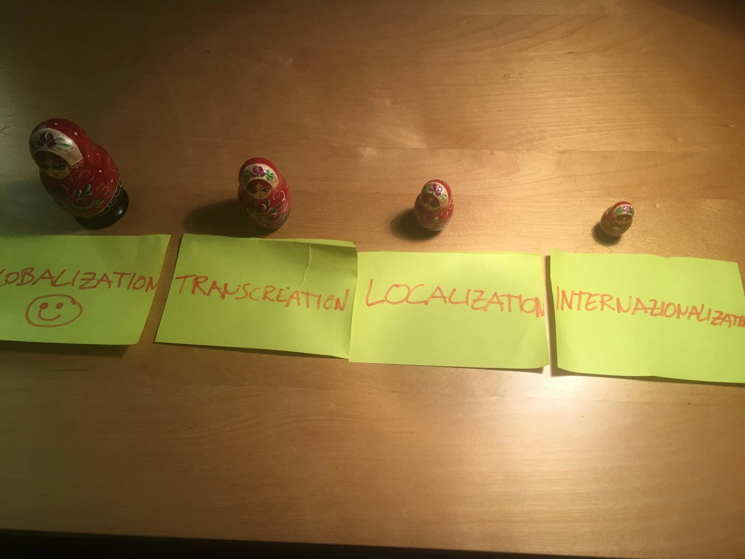 Globalization, Transcreation, Localization, Internationalization are all related but they are different activities. While the last 3 focuses more on the product, Globalization focuses more on the mindset, it focusses on being more part of the NDA of the company. When we combine all these processes all together we are ready to have a memorable product that it will be never forgotten, like that little matryoshka doll that traveled from a small city of Russia to Valencia during 4000 km, a doll that I still own bringing fond memories from my childhood :)