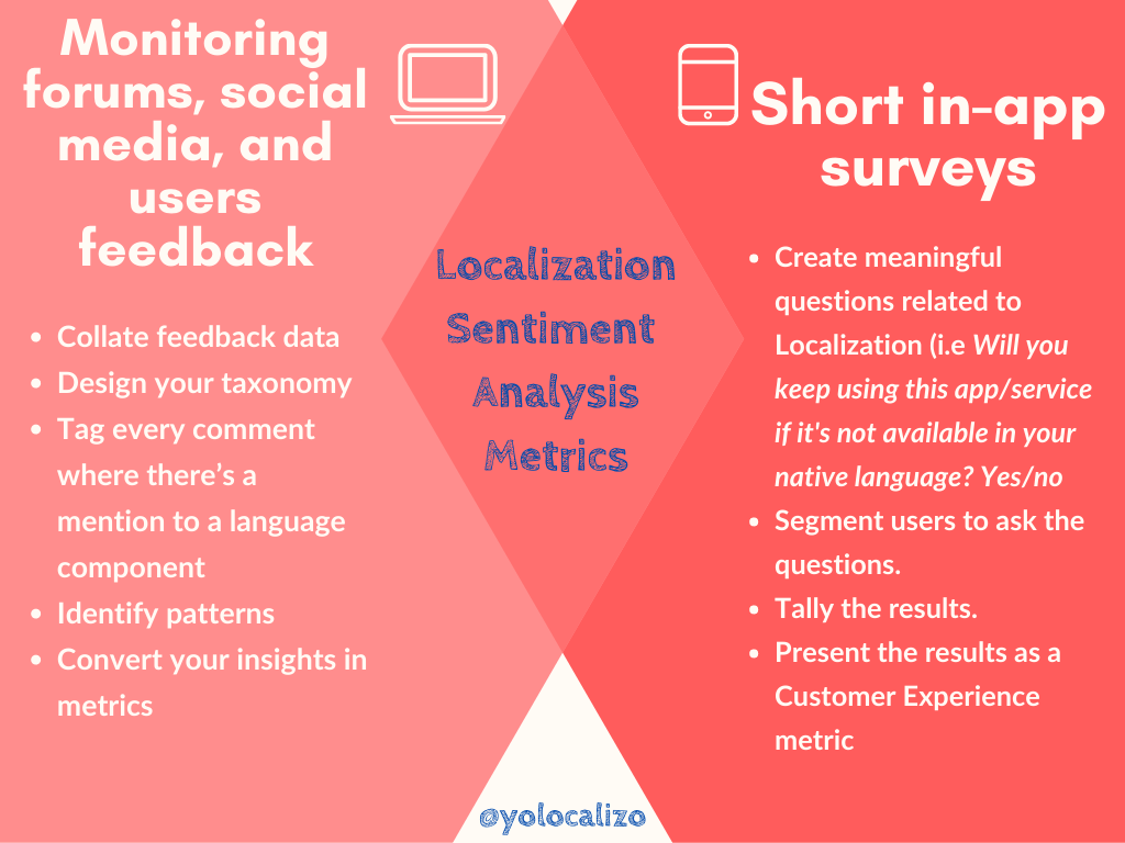 Users see the product as a whole, and they don't distinguish between QA efforts, marketing efforts, coding efforts, or localization efforts. Therefore we need to find a way to isolate the language contribution to the customer experience. Sentiment Feedback shows us how to find a way as localization professionals to quantify customer experience with methods such as sentiment analysis or in-app surveys.